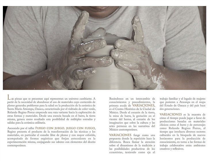 VARIACIONES funge como una propuesta donde la repetición hace la diferencia. Busca llamar la atención sobre el dinamismo de la tradición y las posibilidades productivas de los ceramistas, teniendo como eje el trabajo familiar y el legado de mujeres que pusieron a Atzompa en el mapa del Estado de Oaxaca y del país hace dos generaciones.